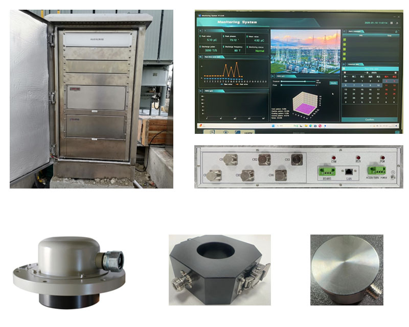 变压器局部放电在线监测系统主要由超高频传感器、高频传感器、超声波传感器、、局放分析装置、现场综合监控柜、局放数据库软件、服务器等组成。