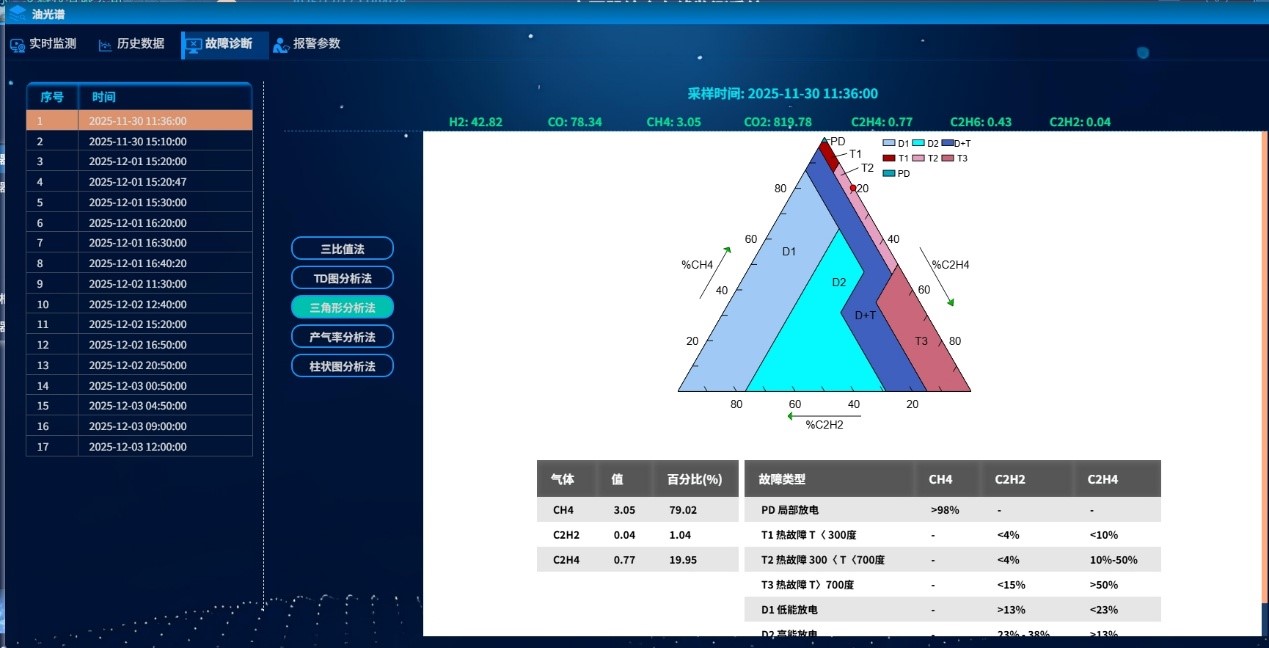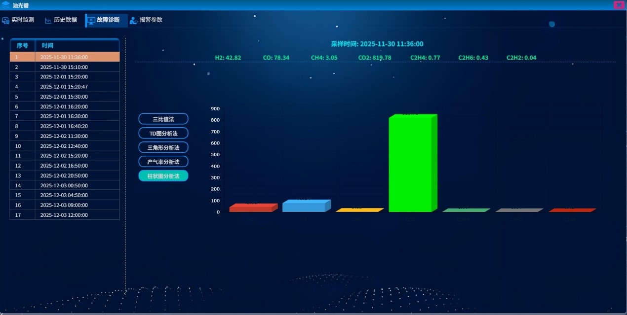 变压器油色谱在线监测系统是基于气相色谱技术的变压器油中溶解多组分气体在线监测产品。系统能设定周期在线检测出变压器油中溶解H2、CO、CO2、CH4、C2H2、C2H4、C2H6、H2O、O2、N2等全组分气体的含量。并通过专家系统判断是否存在潜伏性故障,是过热性故障还是放电性故障,并按设定的报警值进行声光报警。