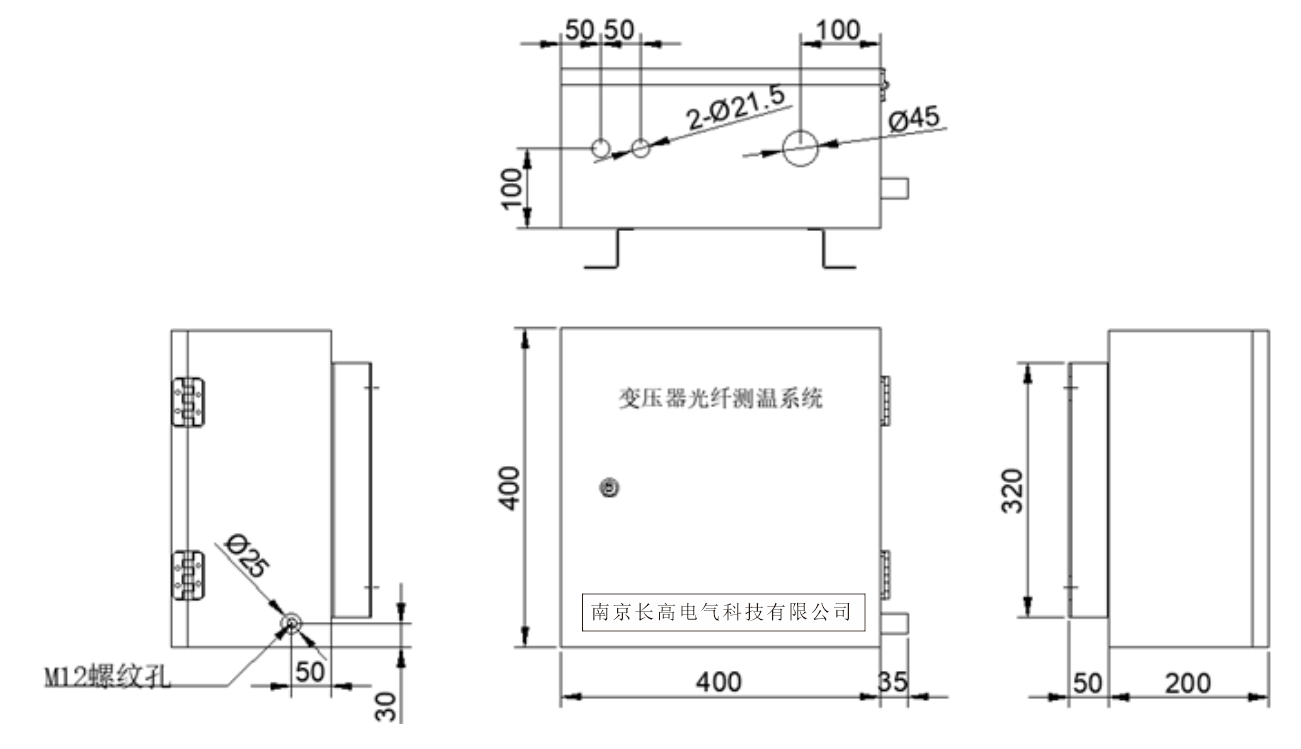 光纤测温箱外形尺寸:长400mm×高400mm×厚250mm